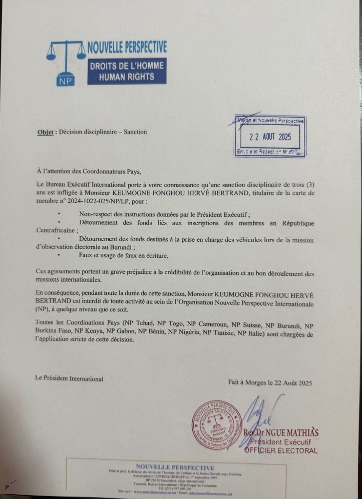 En conséquence, pendant toute la durée de cette sanction, Monsieur KEUMOGNE FONGHOU HERVÉ BERTRAND est interdit de toute activité au sein de l’Organisation Nouvelle Perspective Internationale