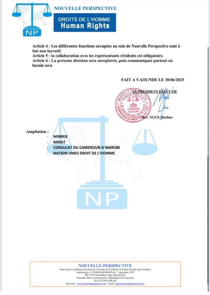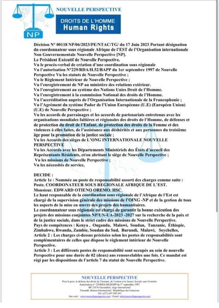 Nouvelle Perspective Internationale (NPI), an international organization committed to the defense of human rights and social justice, hereby informs the public, its partners, and international institutions that a forged document is currently circulating, falsely claiming to appoint a “Sub-Regional Coordinator for East Africa” within the organization.