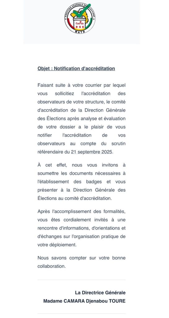 Faisant suite à votre courrier par lequel vous sollicitiez l’accréditation desobservateurs de votre structure, le comité d’accréditation de la Direction Générale des Élections après analyse et évaluation de votre dossier a le plaisir de vous notifier l’accréditation