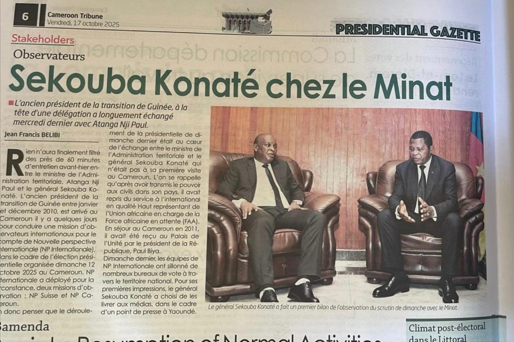Dans le cadre de la présidentielle du 12 octobre 2025, une rencontre a eu lieu avant-hier entre le ministre de l’Administration territoriale, Paul Atanga Nji, et le général Sekouba Konaté, ancien président de la transition en Guinée (janvier – décembre 2010).